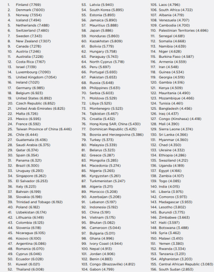 Rapporten er blandt andet baseret på de 156 landes indkomst pr. borger, socialt sikkerhedsnet, gavmildhed, muligheder og grad af korruption.