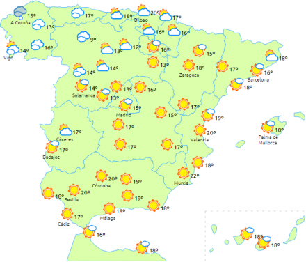 Skyet i resten af den nordvestlige del af halvøen og overskyet i perioder i Pyrenæerne, Extremadura, Castilla-La Mancha og det vestlige Andalusien.