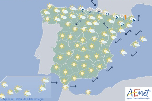 Uvejr med lokalt kraftig nedbør i det østlige Catalonien, mens temperaturerne tager et ordentligt dyk nedad i den østlige ende af den nordlige Atlanterhavskyst og den øvre Ebro-dal.