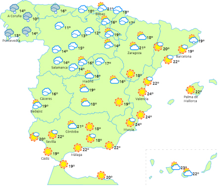 Temperaturer uden ændringer i den nordvestlige tredjedel af halvøen, ved Middelhavskysten, på Balearerne og De Kanariske Øer, mens resten af halvøen oplever stigende dagtemperaturer og faldende nattemperaturer.