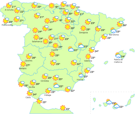 På halvøen kan man nyde mere stabilt vejr med letskyet eller helt klar himmel, bortset fra perioder med overskyet himmel i løbet af dagen i de nordvestlige, indre egne og i Middelhavsområderne, og i sidstnævnte kan det give nogle isolerede og lejlighedsvise byger - muligvis også med barro.