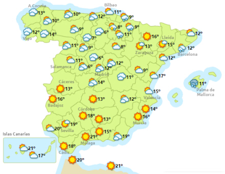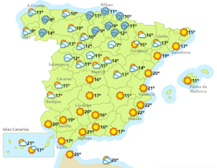I morgen solrigt og omkrig 20 grader i Andalusien og langs Østkysten, mens det er køligt og regnfuldt i nord.
