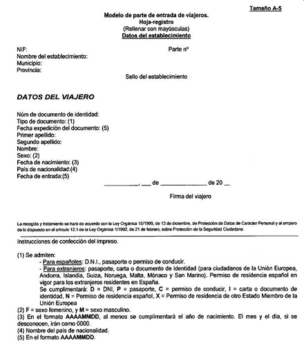 Ligesom et hotel har pligt til at indberette gæster til politiet, gælder nøjagtigt det samme for udlejere af ferieboliger. Indberetningen hedder “Parte de entrada” og enhver over 16 år, der opholder sig i ferieboligen, skal underskrive en sådan. Uanset om man er udlænding eller spanier.