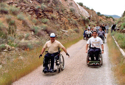 Grøn farve betyder, at stien kan benyttes af alle. Den gule indikerer, at der er en mindre sværhedsgrad for kørestolsbrugere, mens den røde farve viser, at strækningen er direkte uegnet. PMR betyder "Personas con Movilidad Reducida" - altså for personer med nedsat mobilitet.