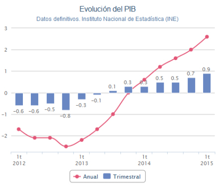 Bruttonationalproduktet, BNP, tegner sig for en stigning på 0,9 procent i første kvartal af 2015 i forhold til de foregående tre måneder, ifølge data offentliggjort torsdag af Statistisk Institut, INE.