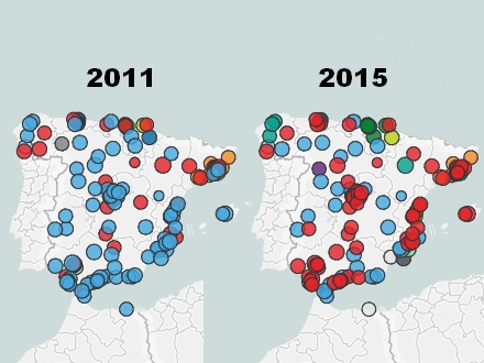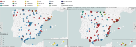 Ved at placere musen i de enkelte cirkler i 2015-grafikken til højre, vises et popup-billede med navnet på kommunen, provinsen, navnet på den nye borgmester (alcalde), i parentes parti-forkortelsen og nederst, hvor mange byrådsmedlemmer der er i den pågældende kommune.