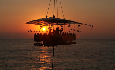Der er plads til 22 gæster, og alle er fastspændt til et lædersæde, der er fastgjort til et spisebord. Hele balladen er så forbundet med en kran, der tager madoplevelsen op i luften.