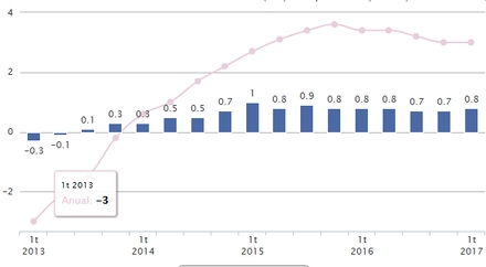 Den spanske økonomi stiger støt og roligt. I første kvartal af 2017 fik den et skub på 0,8 procent, ét procentpoint mere end i de foregående tre kvartaler.