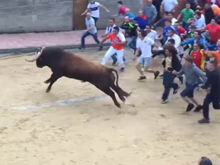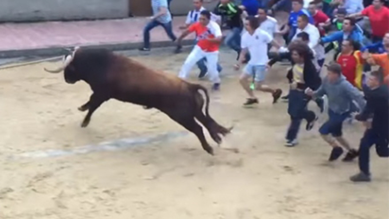 Av, av, av! Søndag blev en mand stanget direkte i skridtet ved et af de traditionelle tyreløb i Yátova, Valencia.
