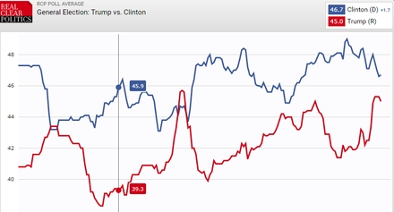 Den seneste sammenstilling den 4. november af nationale meningsmålinger fra hjemmesiden RealClearPolitics giver Hillary Clinton: 46,7 procent og Donald Trump 45 procent af stemmerne.