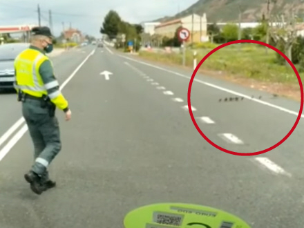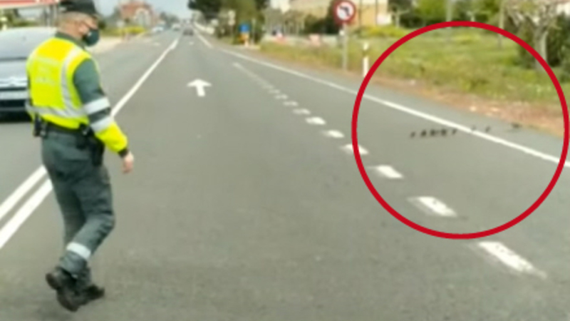 Guardia Civil måtte mandag afskære trafikken, så en andefamilie kunne krydse vejen i sikkerhed.