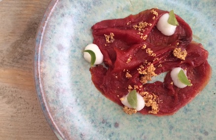 Vandmelonen, vi fik til forret, bliver ovnbagt i 12 timer, derefter frosset, optøet, frosset, optøet, frosset, optøet og så bagt i ovnen igen. Og det var bestemt interessant - og på den go’e måde!