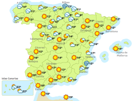 De Baleariske Øer får overskyet himmel og nedbør i perioder, men det skulle bliver ret kedeligt hele dagen på den nordlige del Mallorca og på Menorca. De Kanariske Øer får også overskyet himmel og regn – nedbør mest sandsynligt på de vestlige øer.