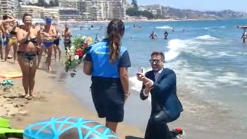 VIDEO: Iført jakkesæt og redningsvest ankom en mand til stranden på en vandscooter. Blandt alle strandgæster gik han på knæ i sand og vand for sin kæreste, der var på arbejde som strandvagt.