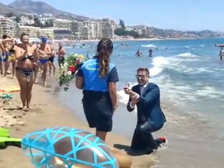 Med en giga oppustelig ring og en mindre og mere ægte én i lommen ankom en forelsket mand til stranden i Torreblanca, Fuengirola, i Málaga-provinsen.