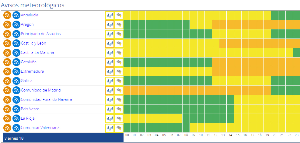 Der forventes skyet eller overskyet himmel over store dele af Atlanterhavområderne, Middelhavsområdet i Andalusien og den nordøstlige del af halvøen med udbredt regn og byger, der kan blive ledsaget af torden. Som nævnt lokalt meget tung eller vedholdende regn ned hagl, men det er dog særligt i bjergrige områder.