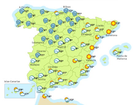 Burgos, León og Palencia i Castilla y León er i dag i gult beredskab på grund af tøvejr, så der kan komme oversvømmelser. Omvendt er der også gult beredskab i de to sidstnævnte på grund af sne sammen med Soria i samme region, Huenca i Aragón, mens man i Navarra forbereder sig på en ordentlig bunke sne – her er man helt oppe i næsthøjeste beredskab i området, der grænser op til Frankrig.