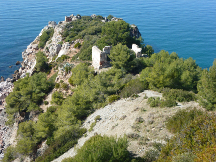 Stien fortsætter nedad, og der er ikke noget at tage fejl af. På et tidspunkt kommer man til en stejl kløft, og her skal man så tage stilling til, om man vil en tur ud på den lille fine halvø, der ligger nedenfor. Stien ud til halvøen går mod højre lige ved kløften og kan anbefales. Der ligger nemlig et par spændende ruiner derude, og helt ude på spidsen holder en koloni af sjældne havfugle til. Halvøen er meget lille, så man næsten føler, at man har fået sit eget lille sted.