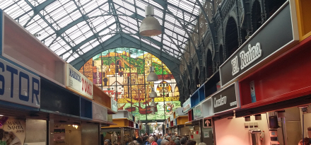 På vores vej kommer vi også igennem markedshallen Atarazanas, som egentlig er et gammelt skibsværft og lå helt ud til kysten. Her skal vi smage lidt skinke og ost fra en af boderne.