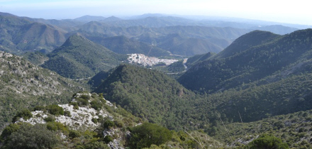 Efter en kort pause går vi tilbage gennem fyrretræerne op til udsigtspunktet El Corzo, hvorfra vi ser ud over Ojén, Mijas og Málaga.