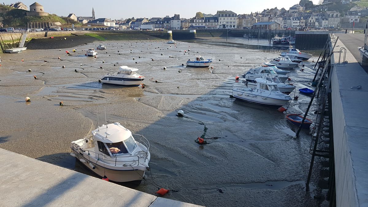 Fortsætter senere på dagen til Port en Bessin, hvor vi ser tidevandsforskellen. Her er der en sluse som holder på vandet i den indre havn, mens vandet falder adskillige meter (7,4 m iht tidevandstabellen) ude i yderhavnen og de mindre både står på bunden og venter på at vandet vender tilbage. Det er stadig imponerende.