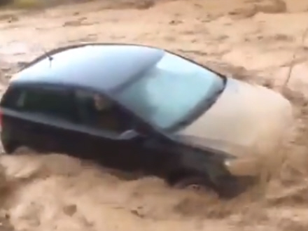 På den første video nederst i artiklen kan man se, hvordan de sidder fanget i deres bil, mens den langsomt bliver slugt og trukket med af vandmasserne.