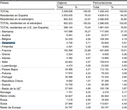 Samlet ankom der 5.726 danskere, 10.759 svenskere og 1.751 nordmænd, hvilket samlet tegnede sig for 2,27 procent af de samlede 3,36 millioner internationale rejsende i maj:
