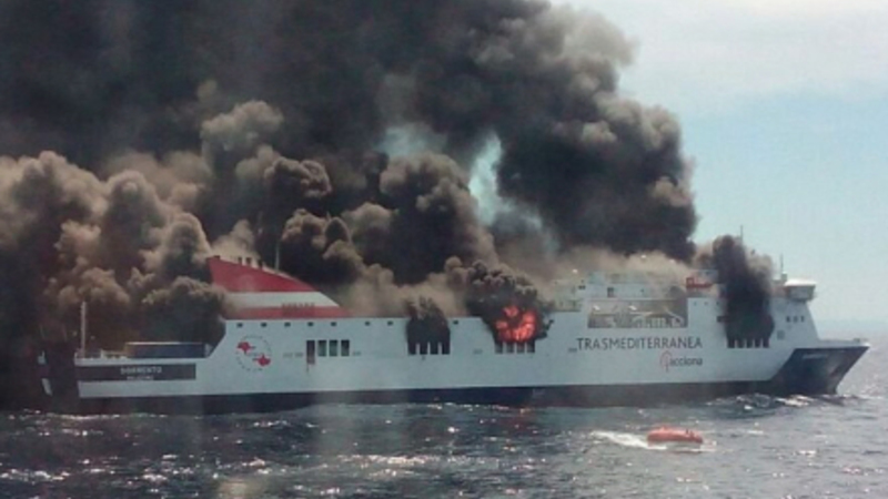 Færgen befandt sig 18 sømil fra Dragonera, en lille ø vest for Mallorca, da der udbrød brand om bord.