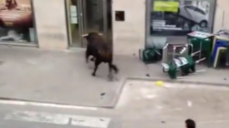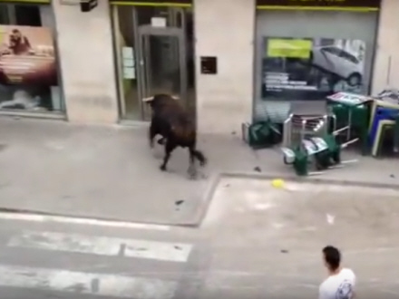 Her besluttede en tyr sig nemlig pludselig for at tage en tur i banken Bankia til stor overraskelse for lokale løbere, skriver euroweeklynews.com.