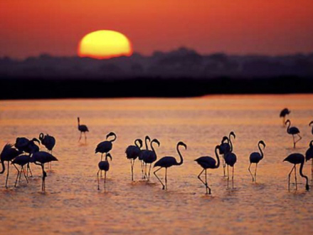 Solnedgang, flamingoer og vilde heste