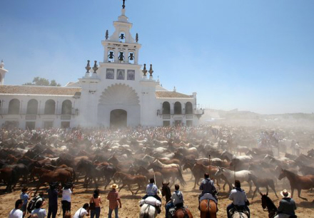 Flokken på flere tusinde dyr passerer kirken med Rocíos Jomfru María for at blive velsignet af præsten. Derefter drives dyrene til hestemarkedet i Almonte.