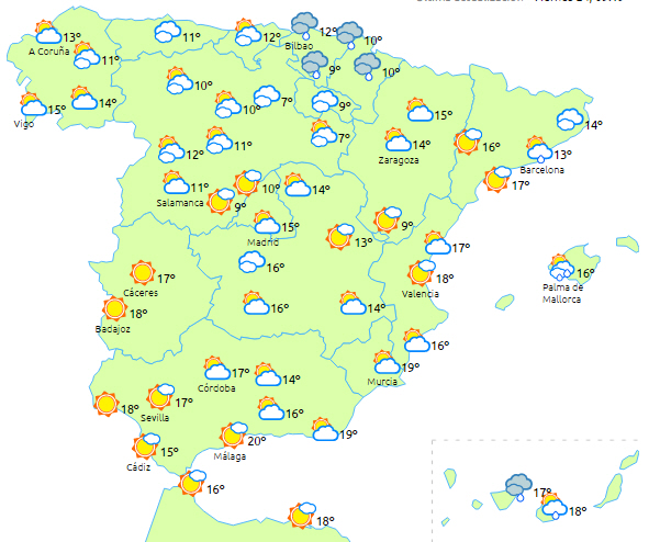Dagstemperaturerne falder i halvøens nordlige og indre egne og på Balearerne, mens de stiger i den sydlige tredjedel. Fortsat lidt frost i den nordlige halvdel af halvø i Pyrenæerne.