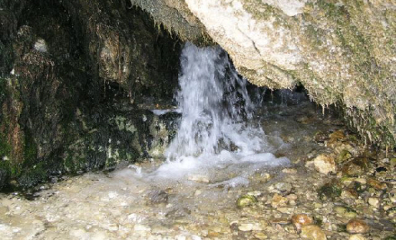 Ved flodens udspring fosser vandet ud fra sprækker i en klippe, og en tavle lige ved udspringet beskriver fænomenet.