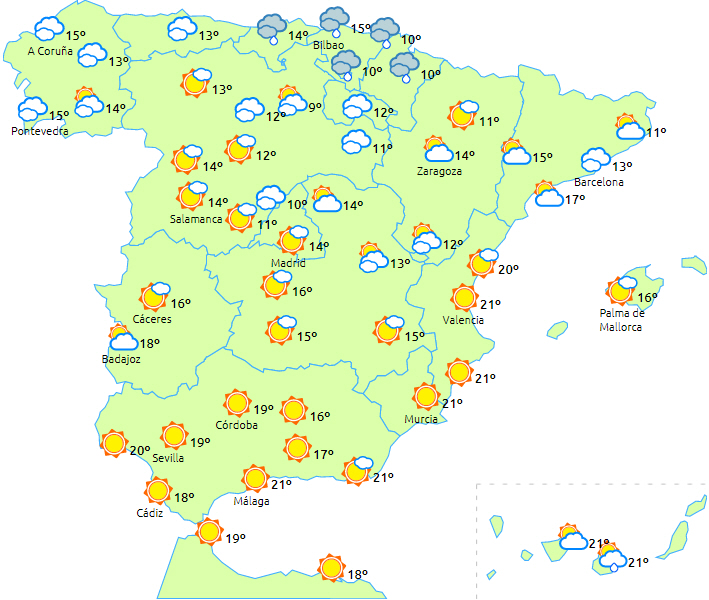 Letskyet eller perioder med flere skyer over halvøens Middelhavsområder og resten af Den Iberiske Halvø, og det er ikke udelukket, at der i begyndelsen af dagen falder lidt svag nedbør i bjergene i det sydøstlige indland.