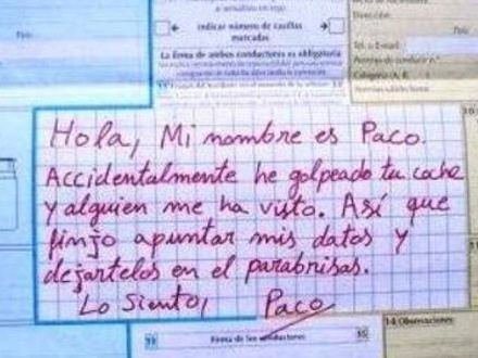 "Paco" arañó un vehículo cuando estaba aparcando y dejó este parte y esta nota al dueño...