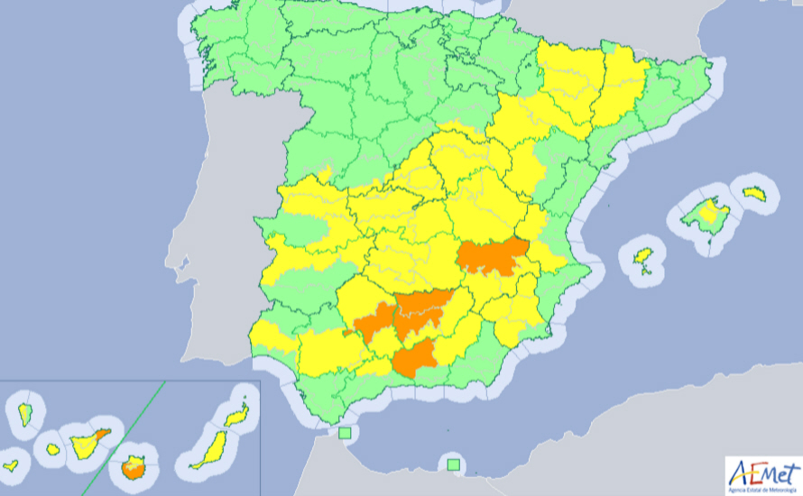 Der advares om betydeligt høje temperaturer i dalene Guadalquivir, Guadiana, Tajo, Ebro, de iberiske bjerge, Murcia, på De Kanariske Øer og i stort set samtlig indre egne i syd.