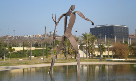 Jardins Del Turia løber langs bunden af en udtørret flod og er fyldt med vandskulpturer, broer, legepladser, caféer, fiskedamme og gademusikanter.