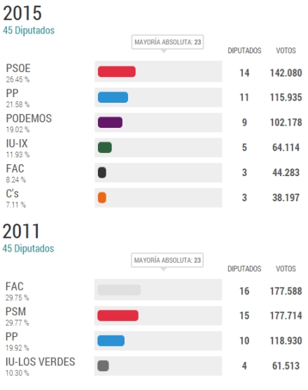 Det virker ikke helt logisk for der er ikke tale om flertal i begge tilfælde. Mens ‘mayoría absoluta’ er ensbetydende med et reelt flertal, benyttes ‘mayoría simple’ blot som det parti, der har fået flest stemmer/pladser. Uden der er tale om et reelt flertal.