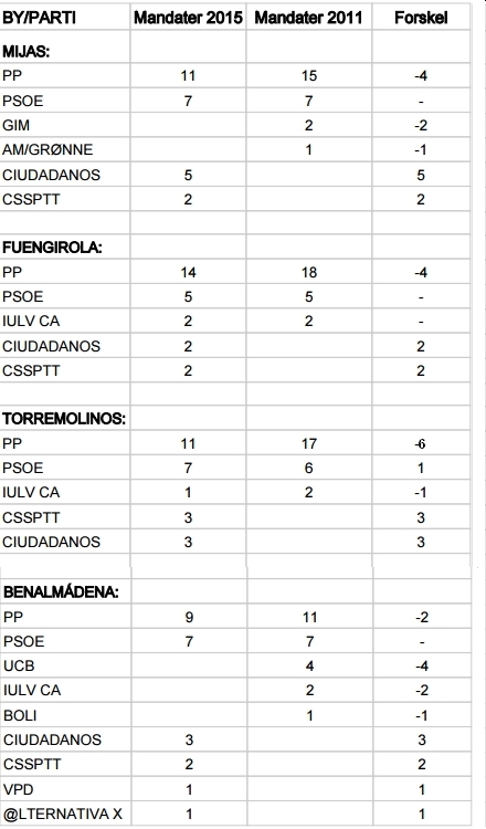 I Mijas, som er den kommune i Spanien med flest danske residente, mistede PP sit absolutte flertal på 15 byrådsmedlemmer og faldt til 11 pladser. PSOE beholdt sine 7 pladser, mens Ciudadanos stormede ind med 5 pladser og valgforbundet CSSPIT med blandt andet Podemos fik 2 pladser. Der er ialt 25 pladser i byrådet.