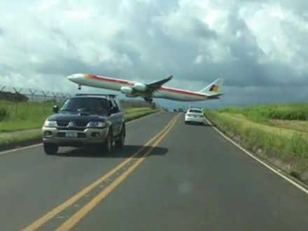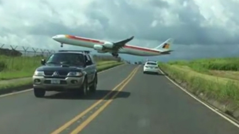 Men da det spanske flys hjul nærmer sig landjorden, kommer det faretruende tæt på biler parkeret for enden af landingsbanen, suser lige henover biler, der kører på en vej, hen over Carlos' hoved, hvorefter det til sidst misser lufthavnshegnet med blot et par meter.