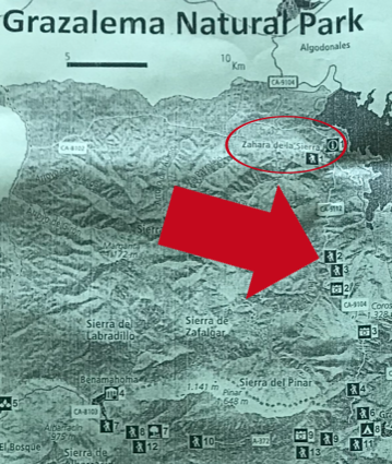 Få kortet over ruterne på turistkontoret i Zahara (cirkel) og Garganta Verde er nummer 2 (pil)