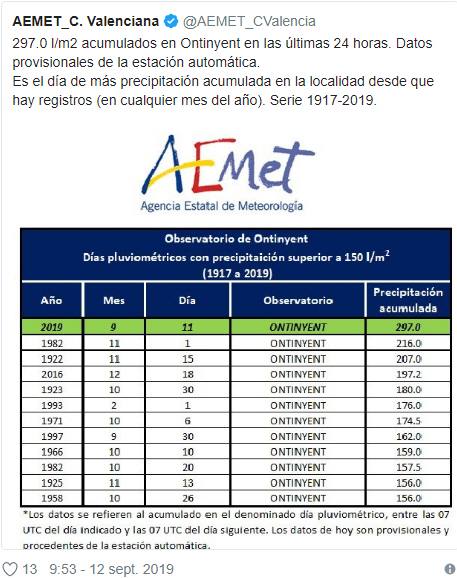 Værst ramt er Beniarres i Alicante, hvor de fik 200 mm på bare seks timer, mens man i Ontinyent fik 113 mm. Ser vi på hele onsdagen, fik Ontinyent faktisk mere regn end på nogen anden dag - nogensinde! Og man startede altså målingerne i 1917.