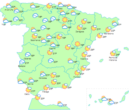 Overskyet himmel med regn på halvøen og Balearerne og byger i Strædet, Andalusiens østkyst, Catalonien og Balearerne. De to sidstnævnte får det som nævnt mest vådt og lokalt tung nedbør med torden, men det er hovedsageligt i løbet af dagens første halvdel. Herefter er der tale om mere spredte byger.
