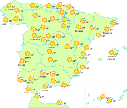 Meget høje temperaturer til det meste af halvøen og De Baleariske Øer - især i Extremadura og Andalusien, hvor vi flere steder kan kommer over 42 grader. Stærk østenvind i Cádiz.