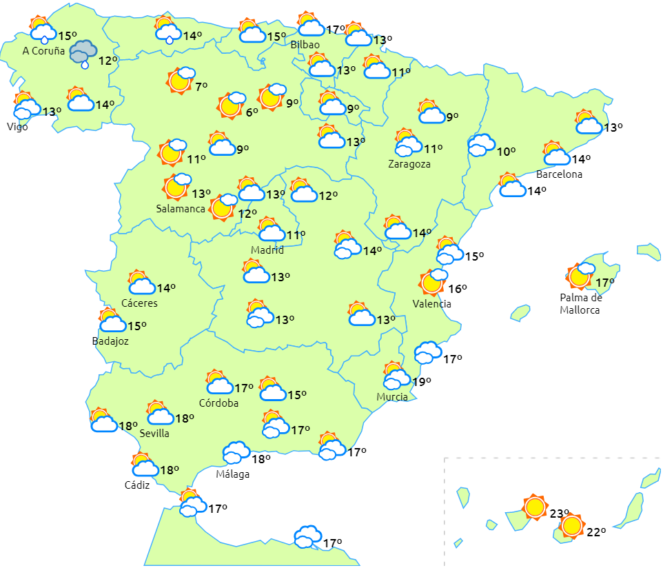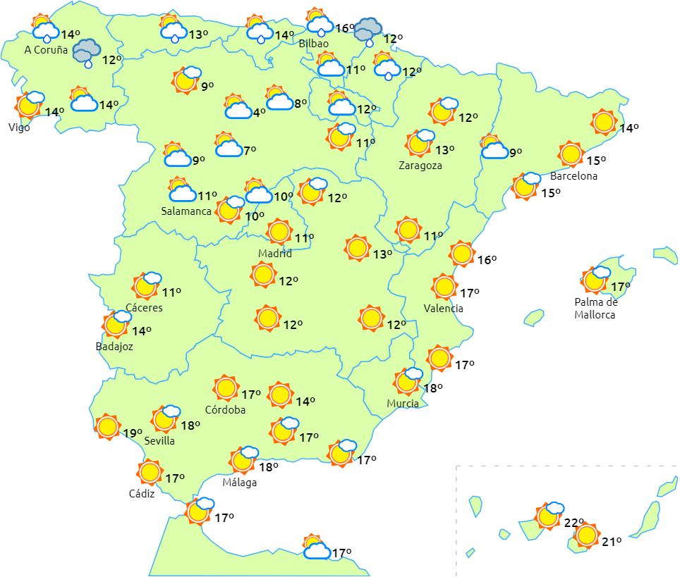 Faldende dagstemperaturer på den nordvestlige del af halvøen, mens de er stigende i den øvre Ebro-dal og ellers få ændringer i resten. Frost i de indre egne og bjergområder.
