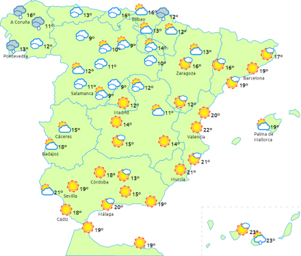 Faldende dagstemperaturer på Balearerne og De Kanariske Øer, mens det også bliver en hel del køligere om natten på den sydlige halvdel af fastlandet. Ellers ikke de store ændringer.