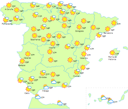 Næsten hele halvøen og Balearerne får letskyet til klar himmel. I Stræde-området, Melilla og på De Kanariske Øer i de højtliggende områder forventes overskyet himmel eller i hvert fald perioder med det og mulighed for nogle generelt svage og lejlighedsvis byger.