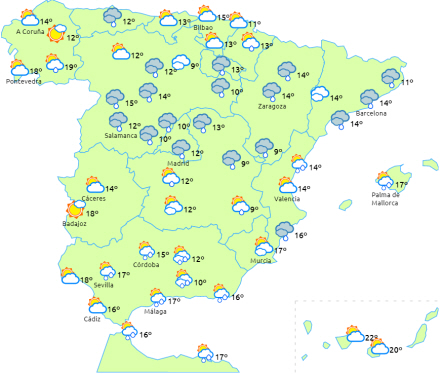Temperaturerne falder på den sydvestlige del af halvøen, Melilla og begge øgrupper, men ellers stiger de generelt i resten. Stigningen vil være lokalt bemærkelsesværdig i Duero-dalen. Frostgraderne er begrænset til de højtliggende bjergområder.