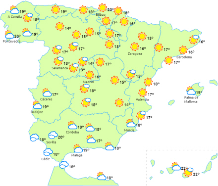 Uændrede dagstemperaturer i det østlige Cantabrien, den øvre Ebro-dal samt på De Baleariske øer og De Kanariske Øer, mens de stiger på resten af halvøen - lokalt bemærkelsesværdige stigninger i Andalusien. Frostgrader i bjergene i den sydøstlige og den nordlige halvdel.