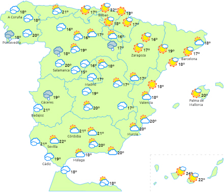 På resten af halvøen er der perioder med letskyet himmel, men i løbet af dagen flere skyer i de indre områder, hvilket giver regn og lejlighedsvise tordenbyger i Pyrenæerne, De Iberiske Randbjerge og i den cantabriske bjergkæde, men det kan også komme til at dryppe i nærliggende områder og i bjergene i de indre egne.